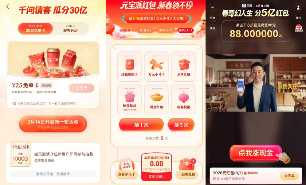 从十亿现金补贴到三十亿生活免单卡,再到技术基建的深度植入,这个春节,头部大厂们无不押上核心资源与最新技术,加入这场空前激烈的流量与入口争夺战。尽管用户间不乏对多次都只抽中“几分钱红包”的调侃,参与热度却丝毫未减。