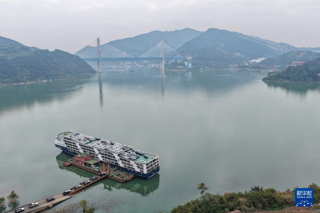 12月5日,在重庆果园港滚装码头,“重庆造”新能源汽车在装船,之后将通过“江海联运”的方式出海(无人机照片)。新华社记者 黄伟 摄