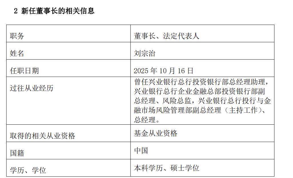10月17日,兴业基金发布关于董事长变更的公告,公司新任董事长为刘宗治,已于10月16日上任,原董事长叶文煌因年龄问题离任。据时代周报记者了解,叶文煌为正式到龄退休,刘宗治的接棒标志着兴业基金平稳完成董事长层面的新老交替。