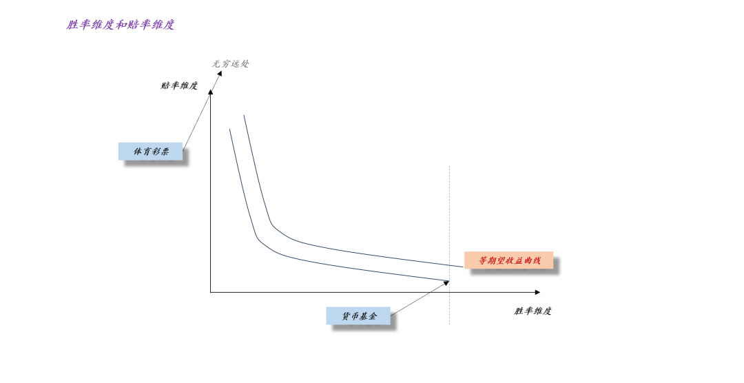 通过上述分析,我们可以抽象出两个独立的维度,一个维度是胜率,它的重要代表是货币基金,净值每天上涨,但是,幅度很低;另一个维度是赔率,它的重要是体育彩票,赔率上百万倍,但是,中奖概率极低。