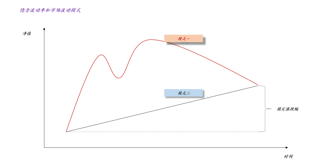 上图刻画了两种波动模式,二者的共性在于给定区间时间内涨跌幅一样,差异则在于波动幅度。其中,模式一表现出巨大的波动性,模式二表现出很大的稳定性。