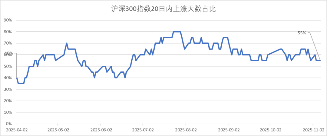 譬如,如上图所示,在目前这个阶段,沪深300指数的上涨天数占比是55%。也就是说,在绝大部分时间内沪深300指数都是上涨的,市场的胜率过半。